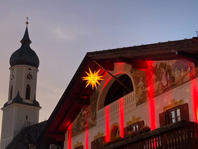 4. Wenn in einer Winternacht der Wind die Schneeflocken verwirbelt, die vom Himmel fallen, verlässt der Stern auf leisen Sohlen sein Versteck. Durch den Türspalt kann er das Haus erkennen, in dem Katharina oben im 1. Stock vor dem offenen Kamin sitzt und schreibt. Links vom Haus steht eine weiß gepuderte Tanne mit hoch erhobenem Kopf. Ihre weitverzweigten Arme laden ihn ein. Mühsam bahnt sich der Stern einen Weg durch den hohen Schnee. Er klettert auf den Baum. Aus seinem seidenen Beutel nimmt er ganz behutsam kleine Kugeln. Jede davon bekommt ihren Platz auf einem der verschneiten Äste. Oben in der Baumkrone angekommen setzt sich der Stern auf einen Tannenzapfen und ruht sich aus. Er streift sich den Schnee von den Kleidern ab. Dabei löst sich etwas Sternenstaub. Sobald dieser auf die Kugeln fällt, beginnen sie zu leuchten. Der Tanne wird ganz warm ums Herz, stolz richtet sie sich auf und strahlt bis hinauf zum Sternenhimmel. Es ist Weihnachten.